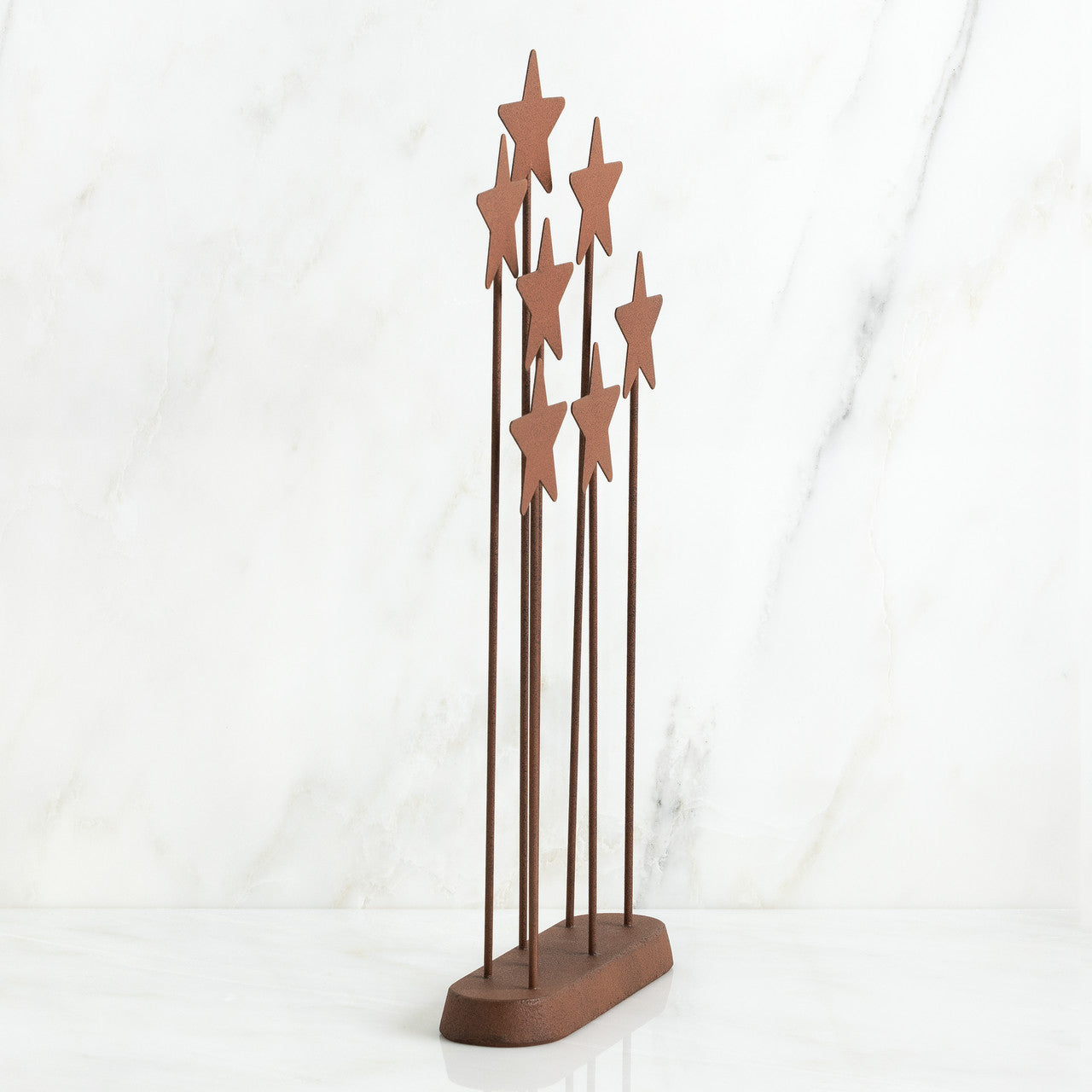 Seven rusted brown metal stars, each atop a metal rod of varying height, and affixed to weighted base. Sized to complement the Nativity set